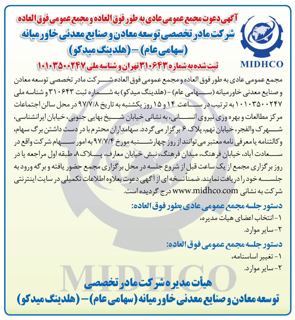 شرکت مادر تخصصی توسعه معادن و صنایع معدنی خاورمیانه ( میدکو ) در سال 1386 به منظور سرمایه گذاری، اکتشاف، استخراج و تولید محصولات فولادی در تهران تاسیس گردید.